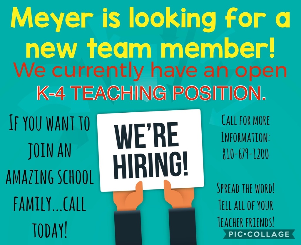 Good morning, Meyer Families! Today, 3/17, is a half-day for our in-person, traditional students. Dismissal will be at 11:25 AM. If you have any questions, please call the Meyer office at 810-679-1200.